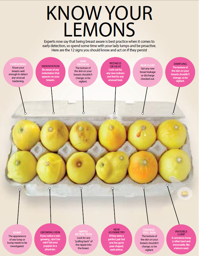 There’s no right or wrong way to do this – but don’t rely on your partners to be doing it for you. Just because your hubby is a boob man doesn’t mean he’s going to find that lemon seed lump about to cause havok – he is focussing on other things! No. You really do have to do this for yourself. In the shower, lying in bed, while getting dressed. It doesn’t matter when or how as long as you do it. Have a good feel, get to know what normal feels like. And then if you’re unlucky enough for abnormal to descend on you then at least you’ll notice.