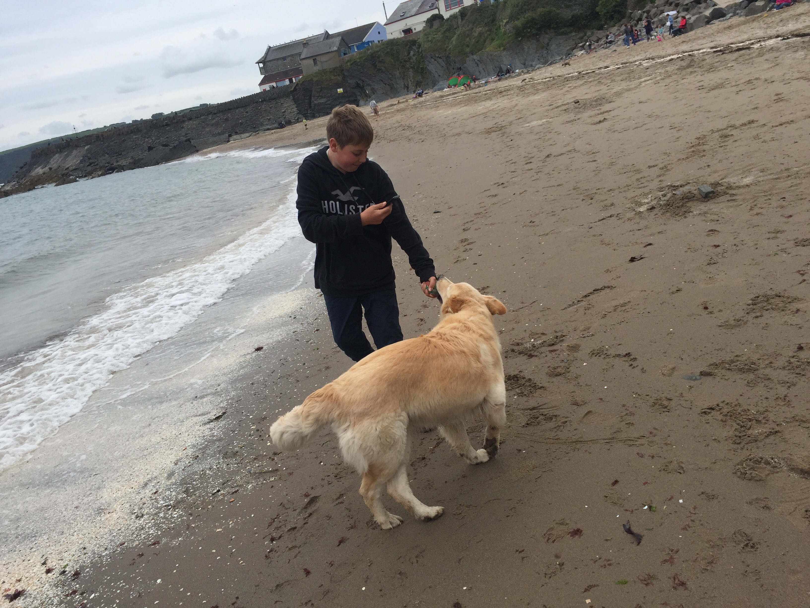 Although we stayed in Ceredigion just a year ago we are based much further south this time. This was deliberate so we could also spend some time on the northern part of the Penbrokeshire coast that we didn’t get chance to visit when we were there a few weeks ago. On a grey bank holiday morning, while back home is bathed in heat, we explore first Poppit Sands and then Newport Sands – both large, expansive beaches in Pembrokeshire. The dog loves it – lots of running for the ball (until she refuses to paddle across the river running through the beach, thereby losing the ball) and playing with the kids.