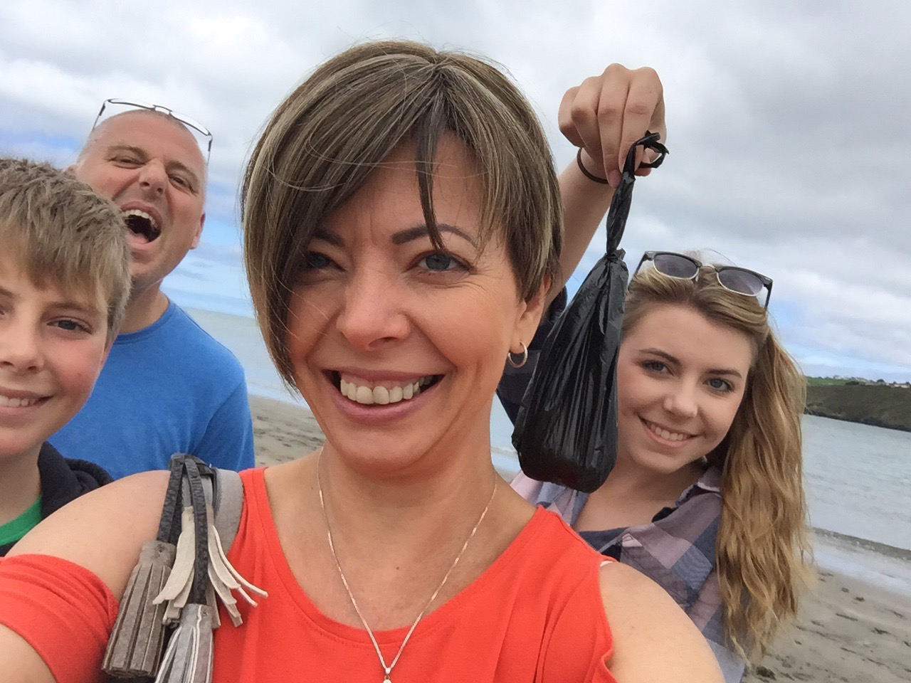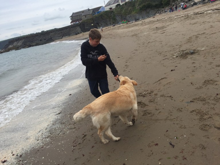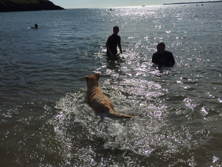Friday, our final day, the sun shines again. We decide to drive out further afield today to Manorbier, a seaside town not far from Tenby. The last full on beach day we attempted wasn’t a great success but we try again – this time making sure that Lilly has a good walk beforehand. I’m seduced by the heat of the sun and in a moment of madness decide to be brave. Wig off. Bikini on. Wetsuit on. I join the boys in the sea. It was bloody FREEZING, even in a wetsuit! Lilly, not a fan of water, also braved the sea for a swim. It’s a great final day of the holiday for all of us.