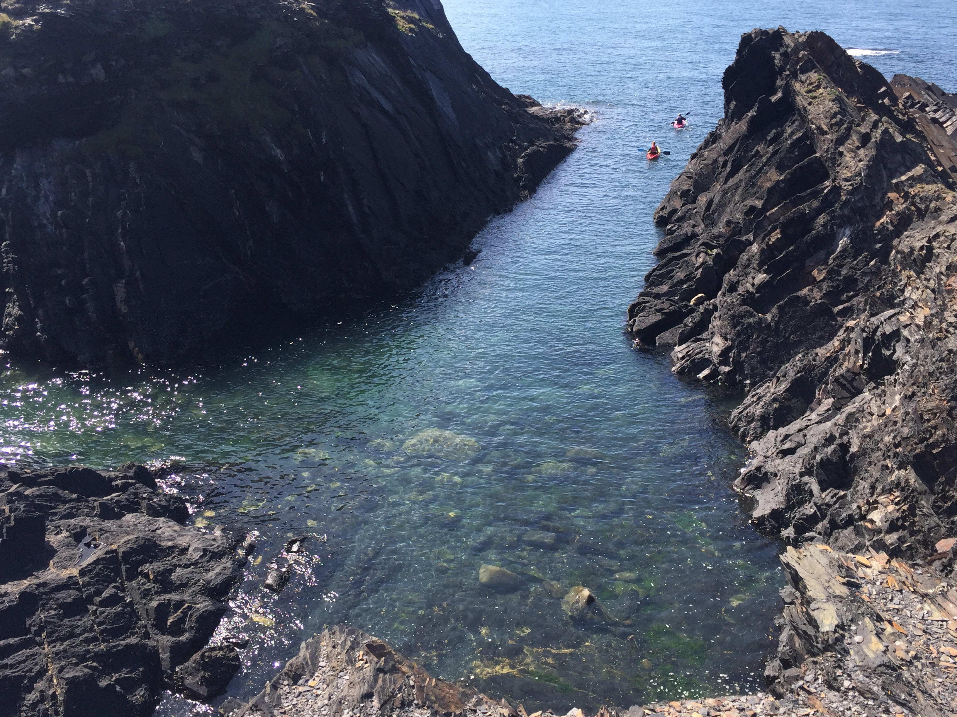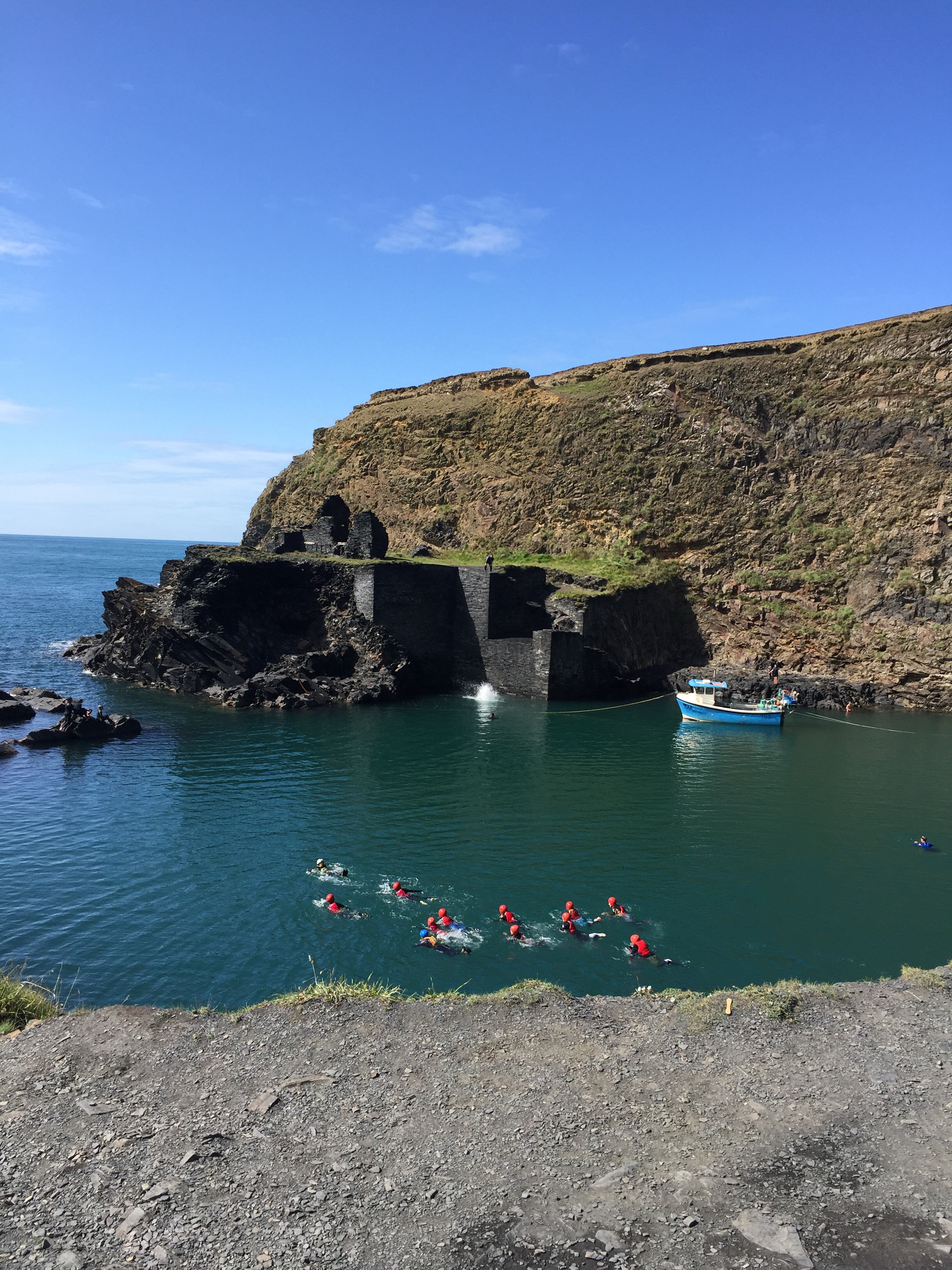 Our next stop is the Blue Lagoon at Abereiddi. Slate was quarried here until the early 20th century. The lagoon was formed when the channel connecting the slate quarry to the sea was blasted, allowing the sea to flood in. The result is a beautiful green water (surely it could be more suitably named????) lagoon, a gorgeous part of our coast, frequented by swimmers, divers, coasteerers and kayakers. The Red Bull Cliff diving world championships were held here a few years back.