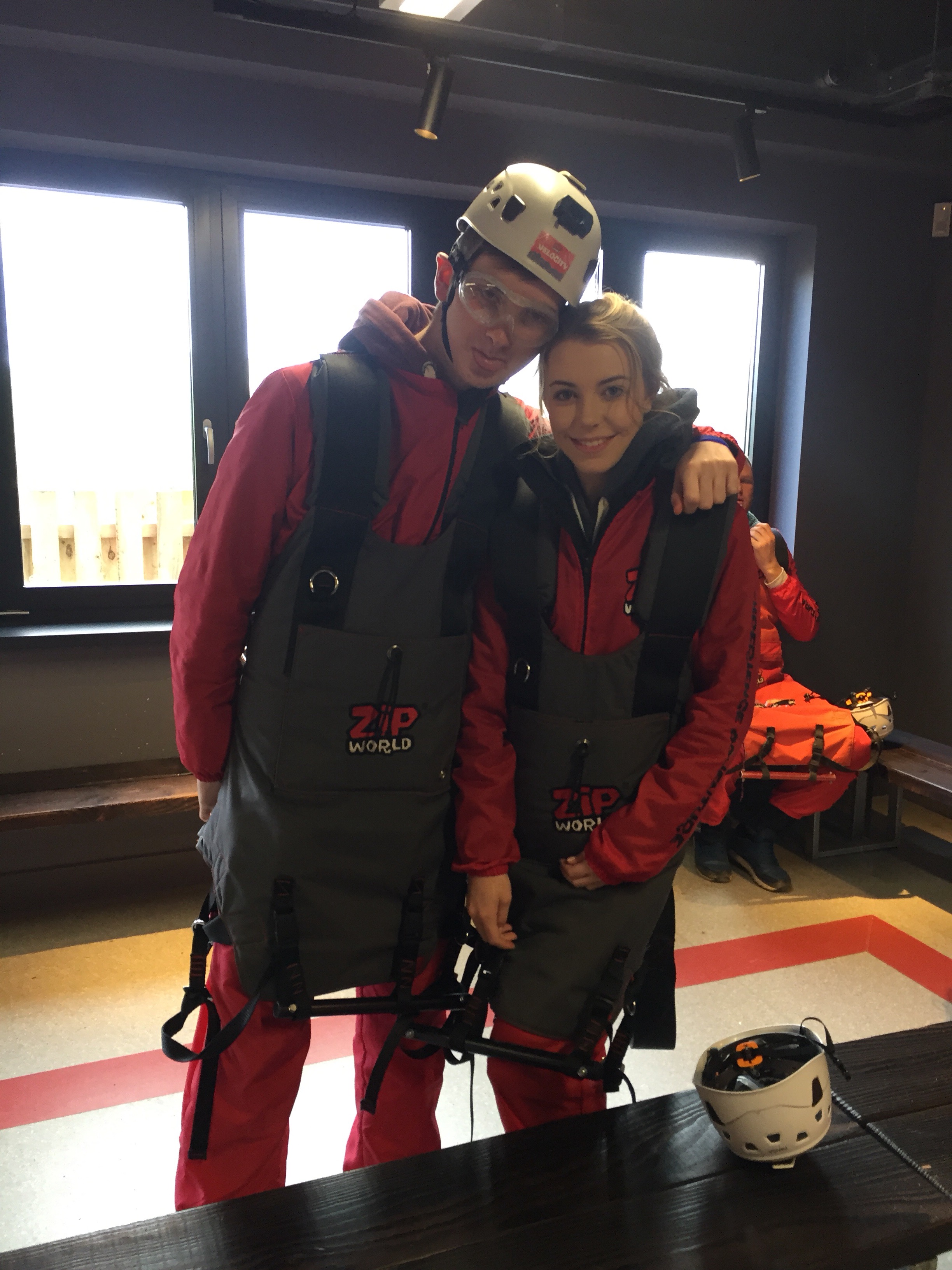 Once kitted our in very attractive boiler suits (not the posh dress and heals I was hoping to be wearing to Tina’s 50th party!) and hard hat (Why? Can’t see that making much difference if you fall from a zip line over 200m above ground!) we trekked up to The Little One – the warm up zip ride.