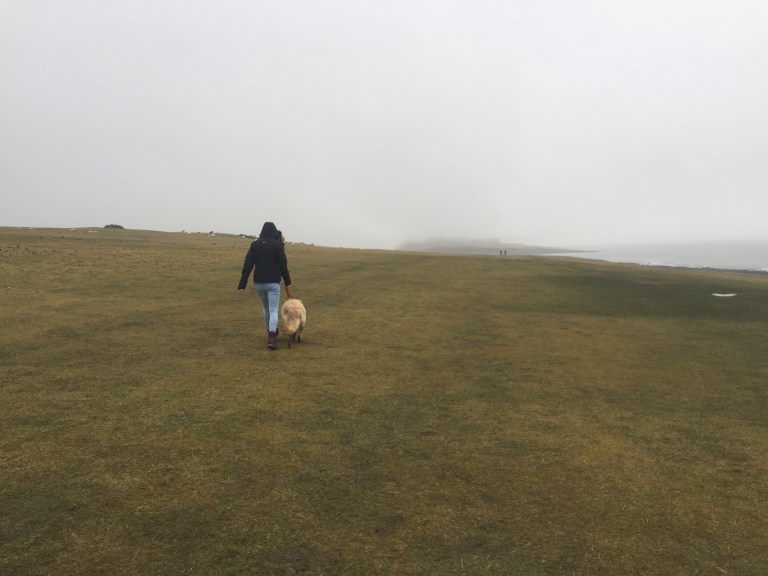 It was still raining as we left the cafe and the kids were keen to head “home” to watch a film. Ad and I wanted to explore some more so we pulled rank, overruled the kids and headed for Dunstanburgh Castle – National Trust ruins on Embleton bay. As we trudged across moorland towards the castle the kids were becoming grumpier and grumpier, moaning non stop. Yes I know you’d rather be wearing flip flops. Yes I know that dragging your ass to a castle in the rain isn’t top of your to do list. Believe it or not it’s not mine either! We couldn’t even see the castle in the distance due to the low lying mist.