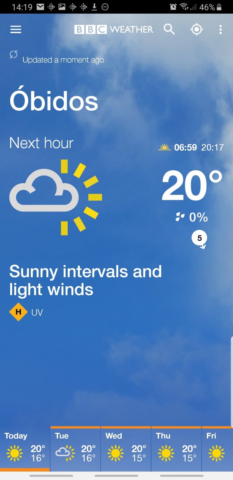 We landed at Lisbon Airport at 7:30pm, the decent slightly bumpy due to the windy conditions and heavy cloud cover. We usually brace ourselves for the heat when stepping off a plane in a hot country, but this time I put my denim jacket on and held it closed. Not a great start. While waiting for our car hire rep to meet us at the airport, I hastily downloaded another 4 or 5 weather apps hoping to find one that predicted 2 weeks of wall to wall sunshine. Sadly they all told the same story – changeable, mixture of sunshine and clouds, windy at times. Should have gone to Greece!